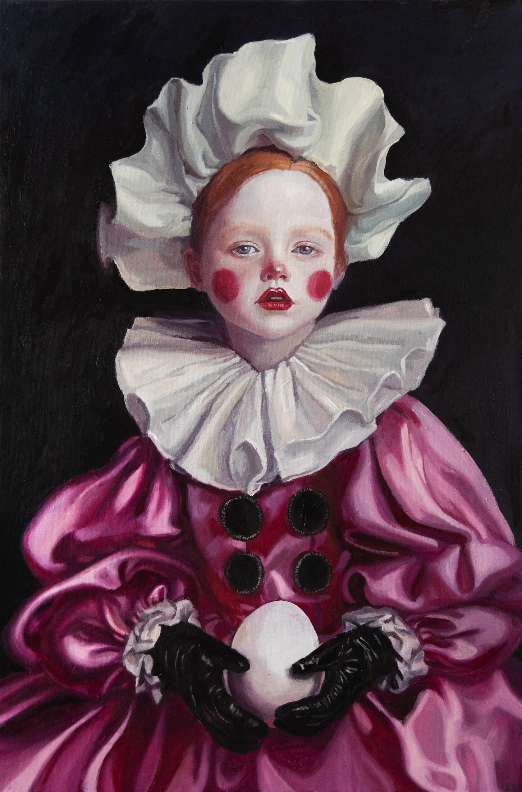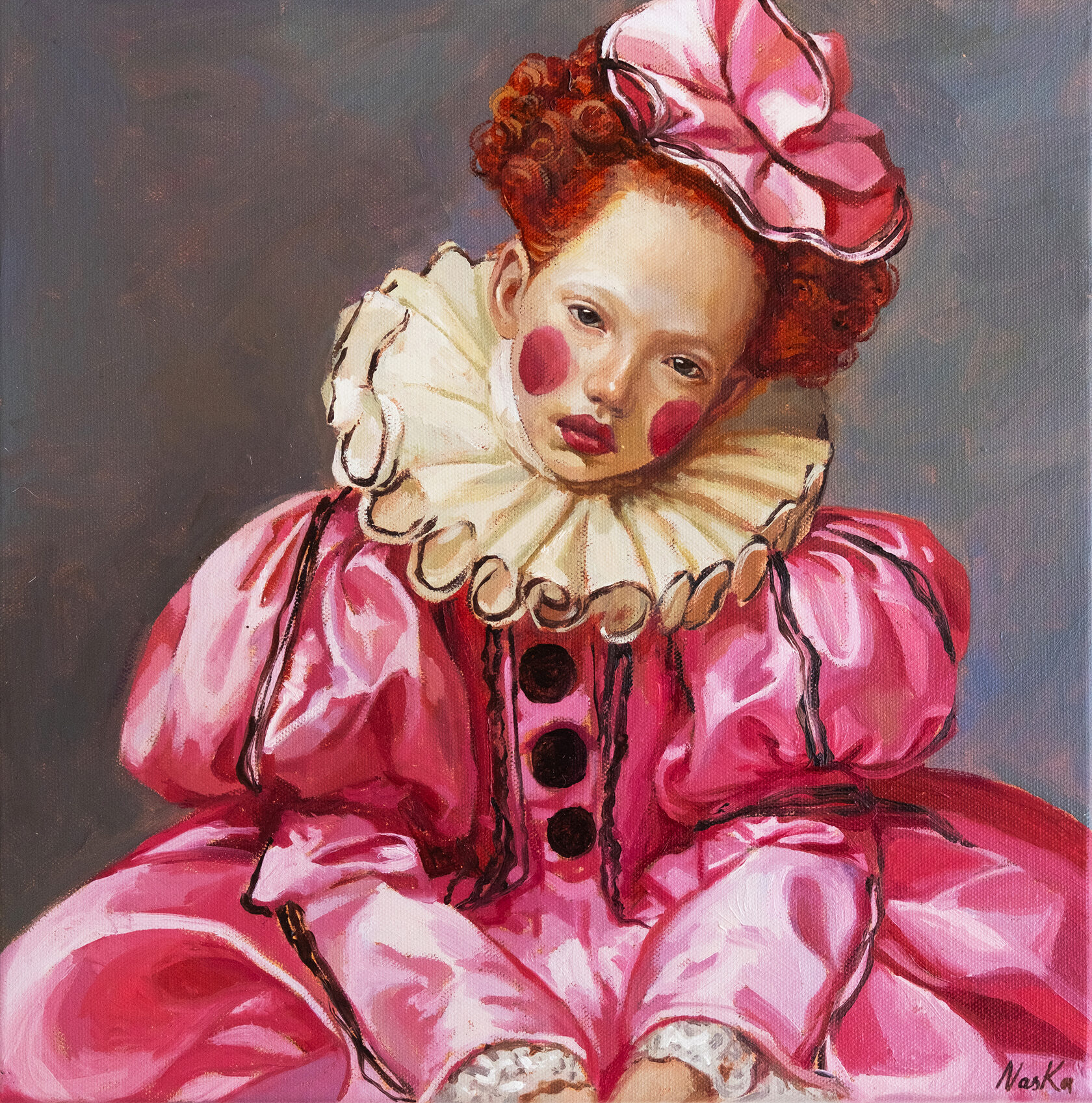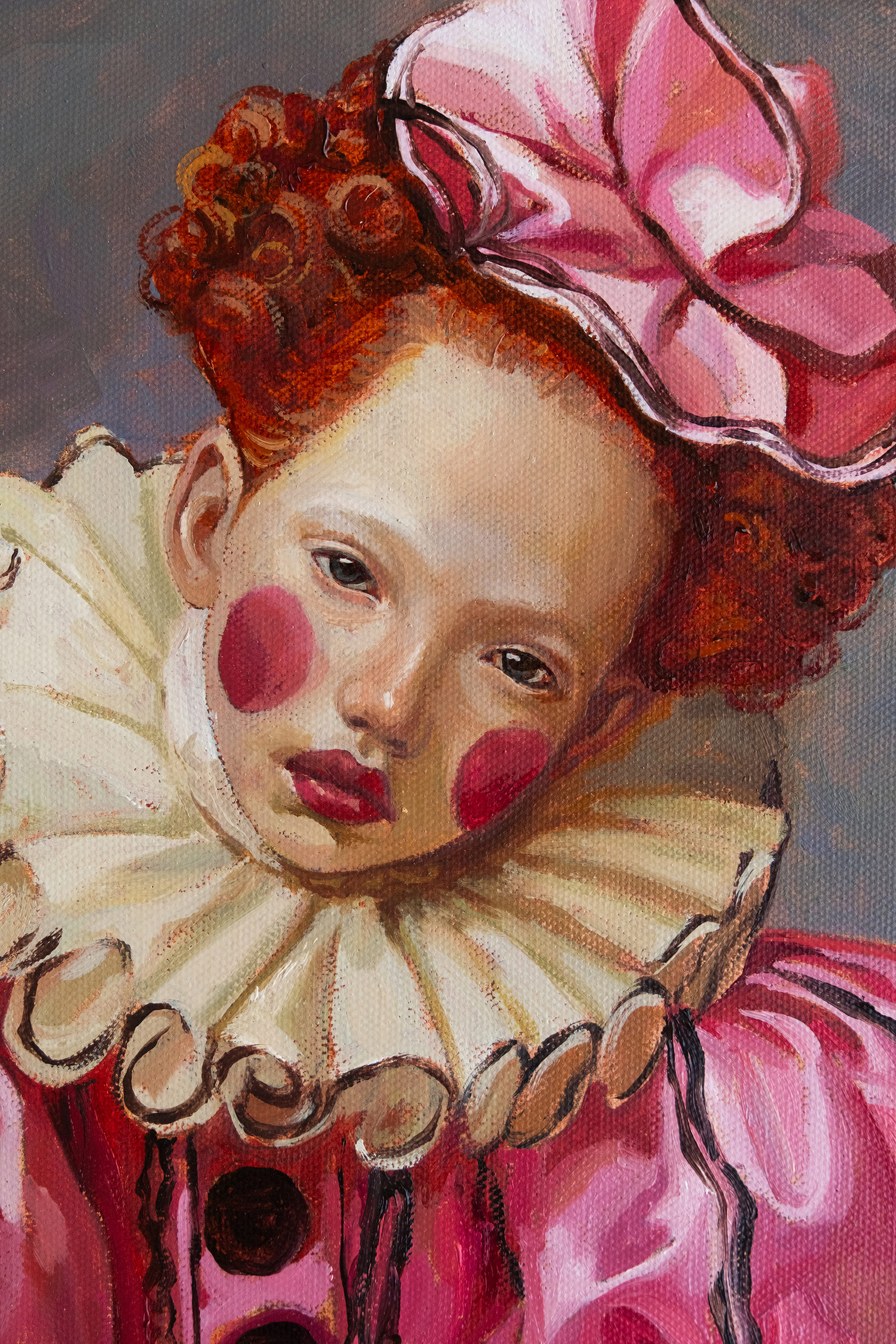 A melancholic yet captivating portrait of a young woman dressed as Pierrot, enveloped in soft pink hues and rich textures. Her porcelain-like skin and delicate expression evoke nostalgia, innocence, and theatrical drama. The bold contrast between light and shadow enhances the depth of her gaze, drawing the viewer into a dreamlike narrative. This oil painting merges classical influences with modern surrealism, creating a striking visual story filled with emotion and timeless elegance.