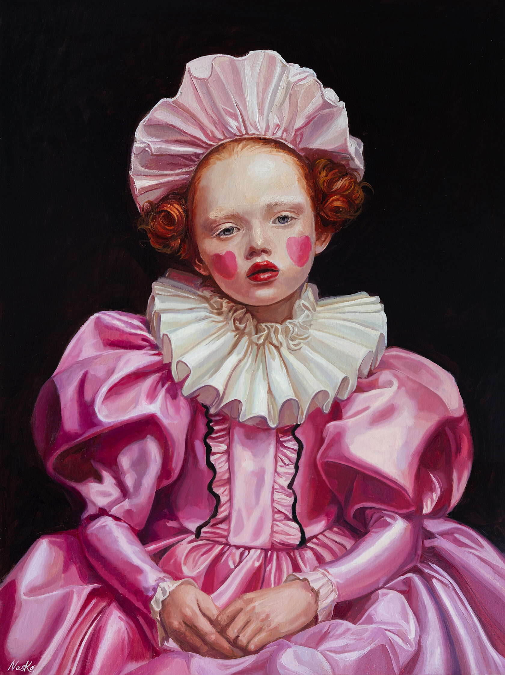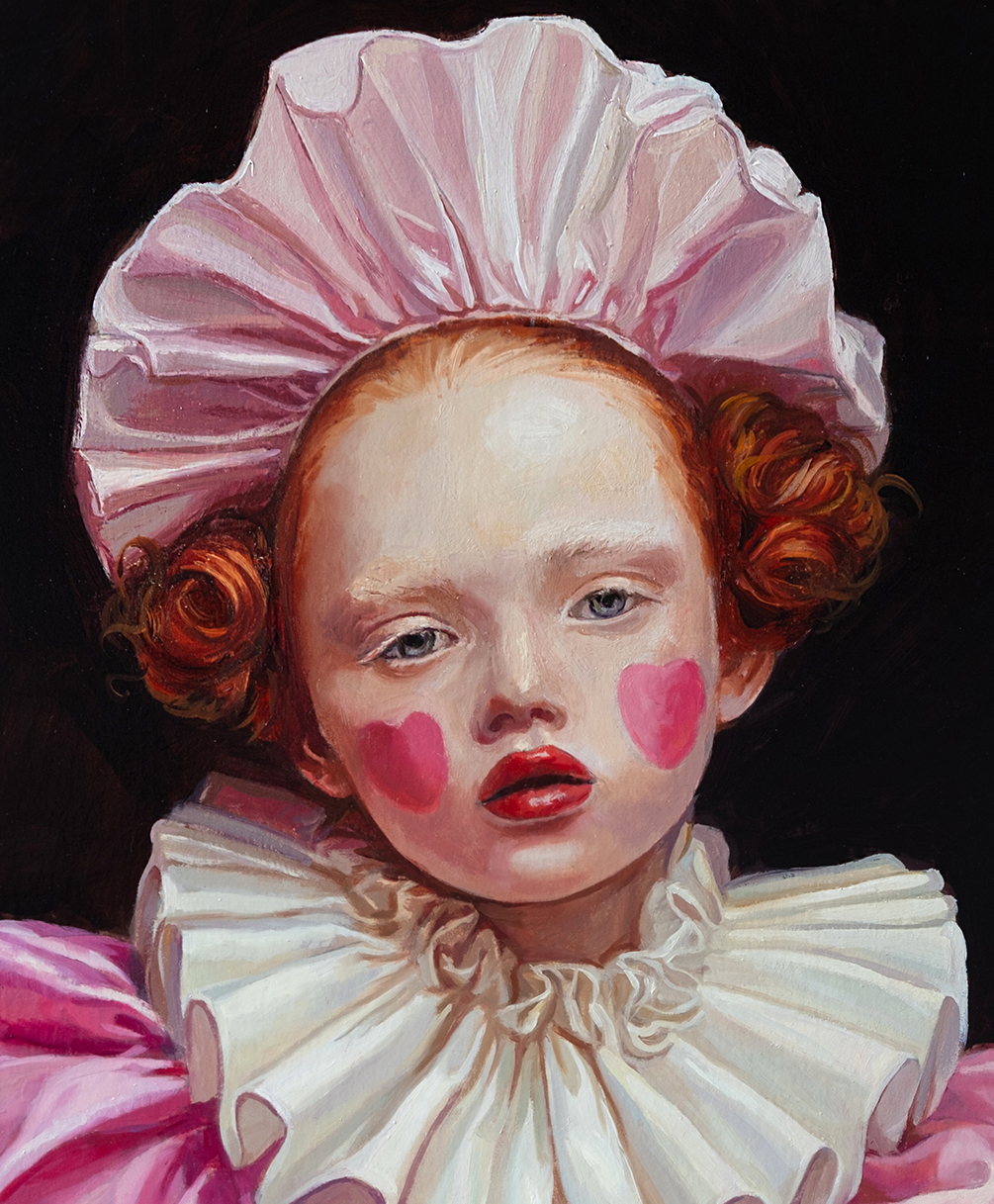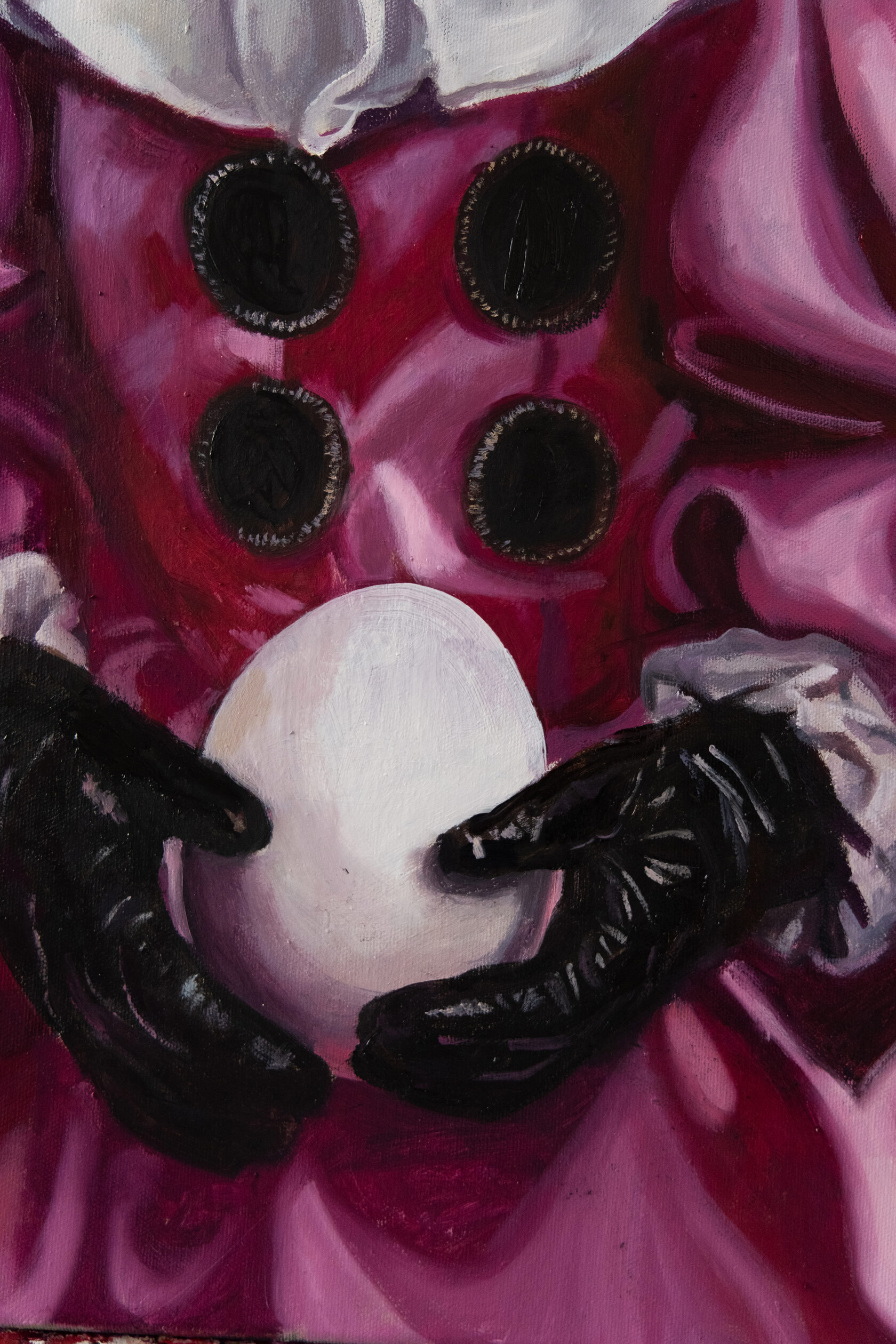 A melancholic yet captivating portrait of a young woman dressed as Pierrot, enveloped in soft pink hues and rich textures. Her porcelain-like skin and delicate expression evoke nostalgia, innocence, and theatrical drama. The bold contrast between light and shadow enhances the depth of her gaze, drawing the viewer into a dreamlike narrative. This oil painting merges classical influences with modern surrealism, creating a striking visual story filled with emotion and timeless elegance.