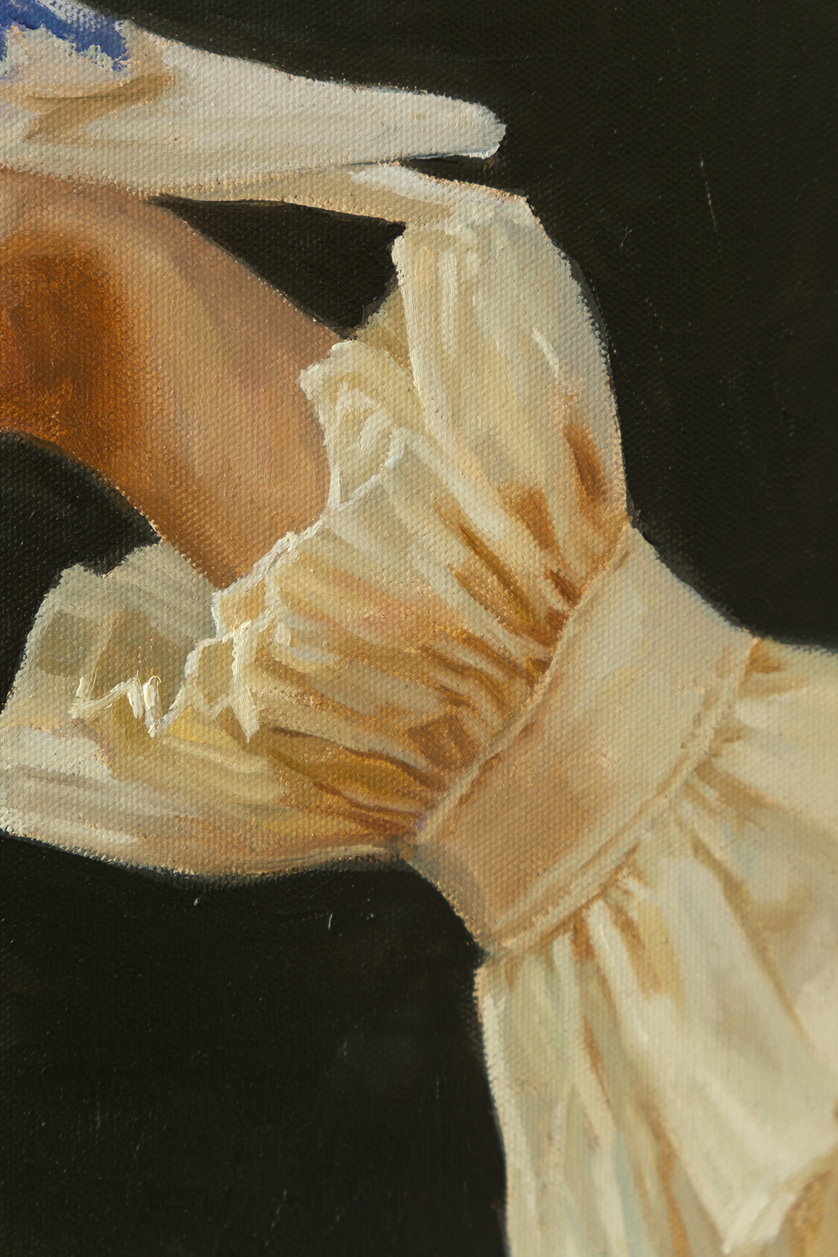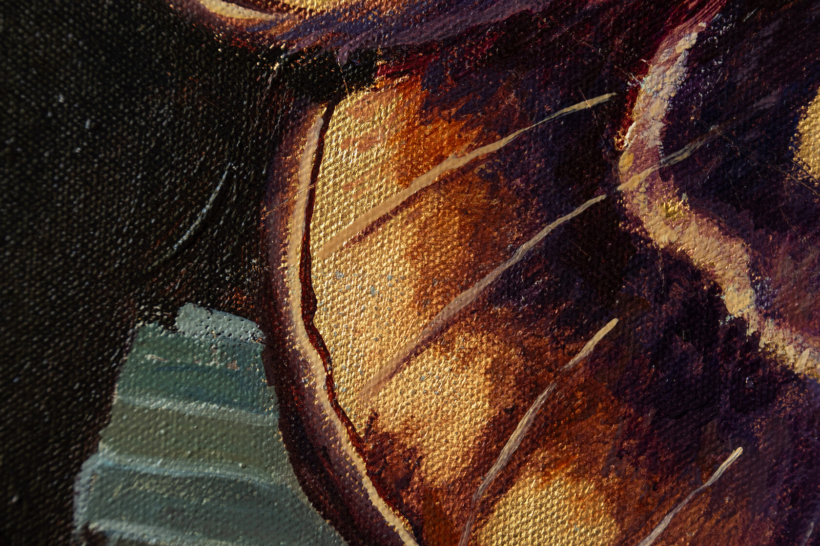 The painting is done in oil on canvas, with visible brushstrokes that make it visually striking and captivating.