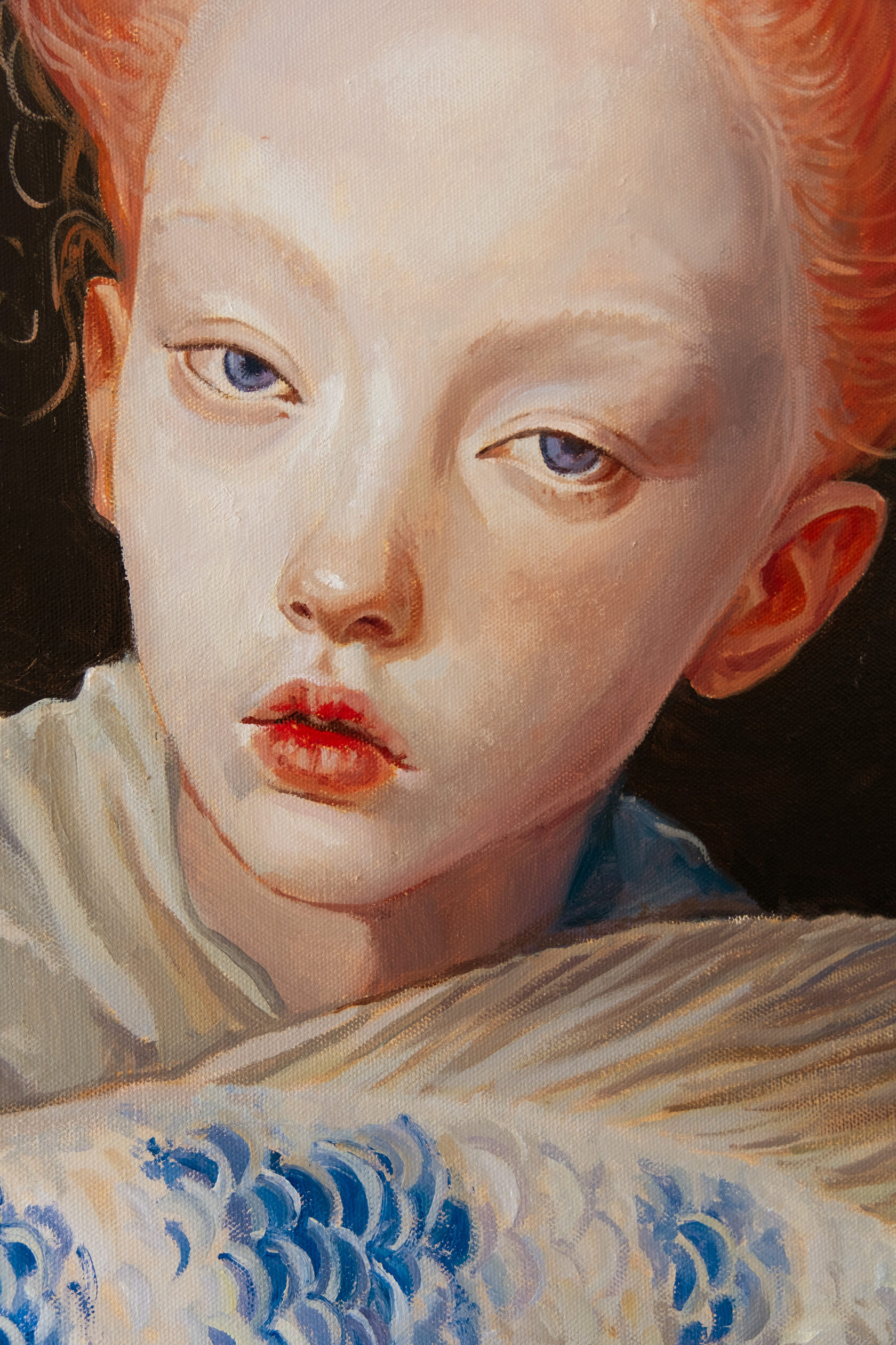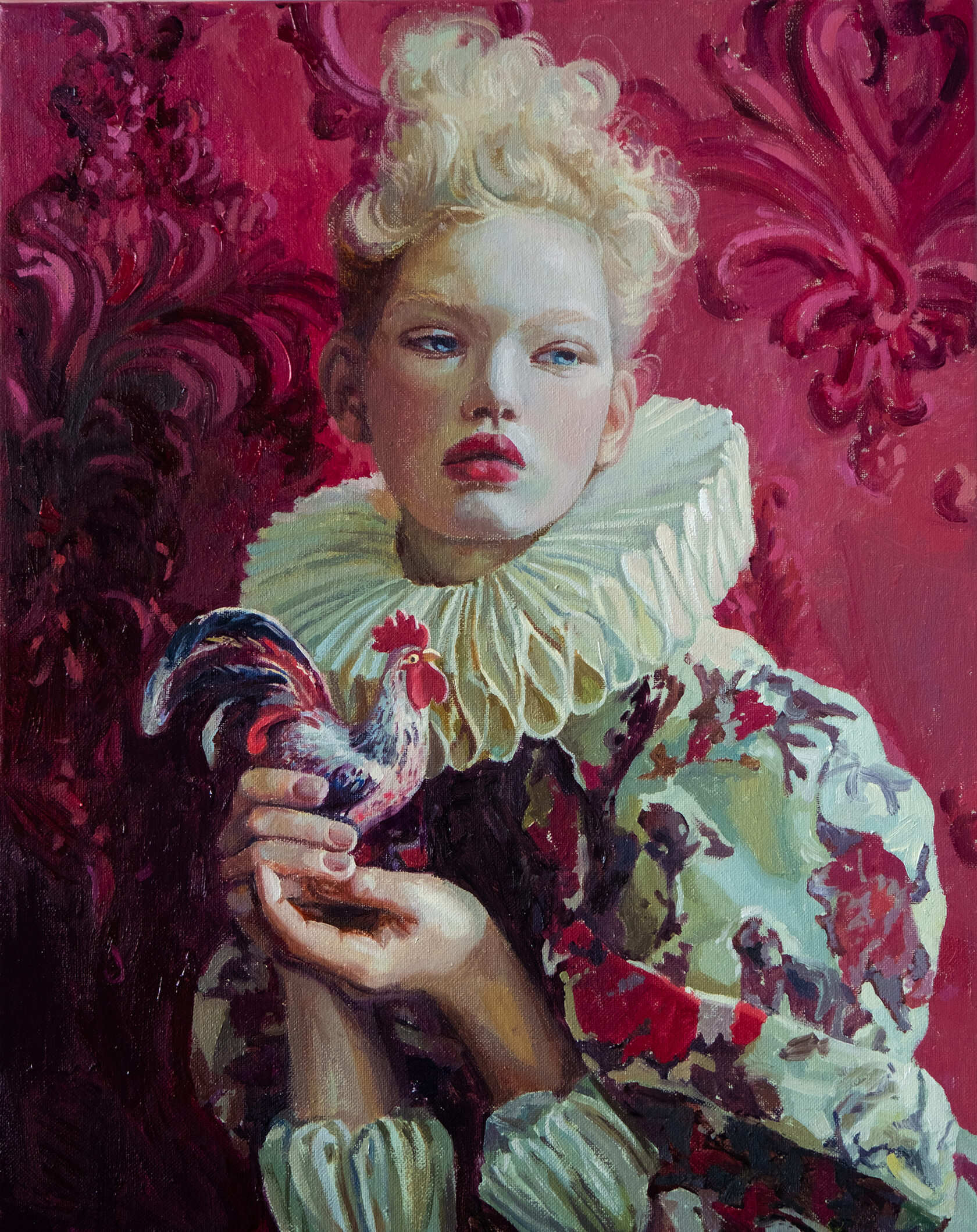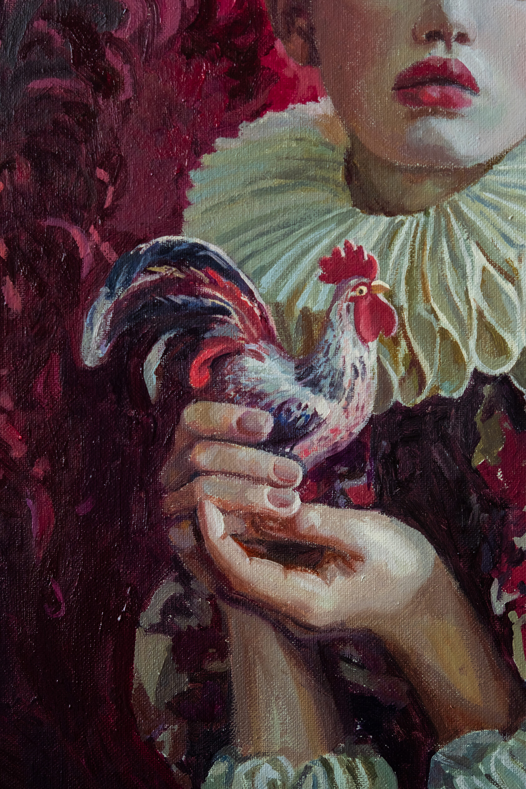 A surreal and delicate portrait of a pale-skinned girl dressed in historical-inspired attire, set against an intricate red background. Holding a small ceramic chicken, she exudes an air of quiet mystery and fragile beauty. The dramatic color contrast and meticulous details bring a sense of tension between innocence and hidden strength. This piece reflects on vulnerability and identity, blending classical portraiture with symbolic storytelling.