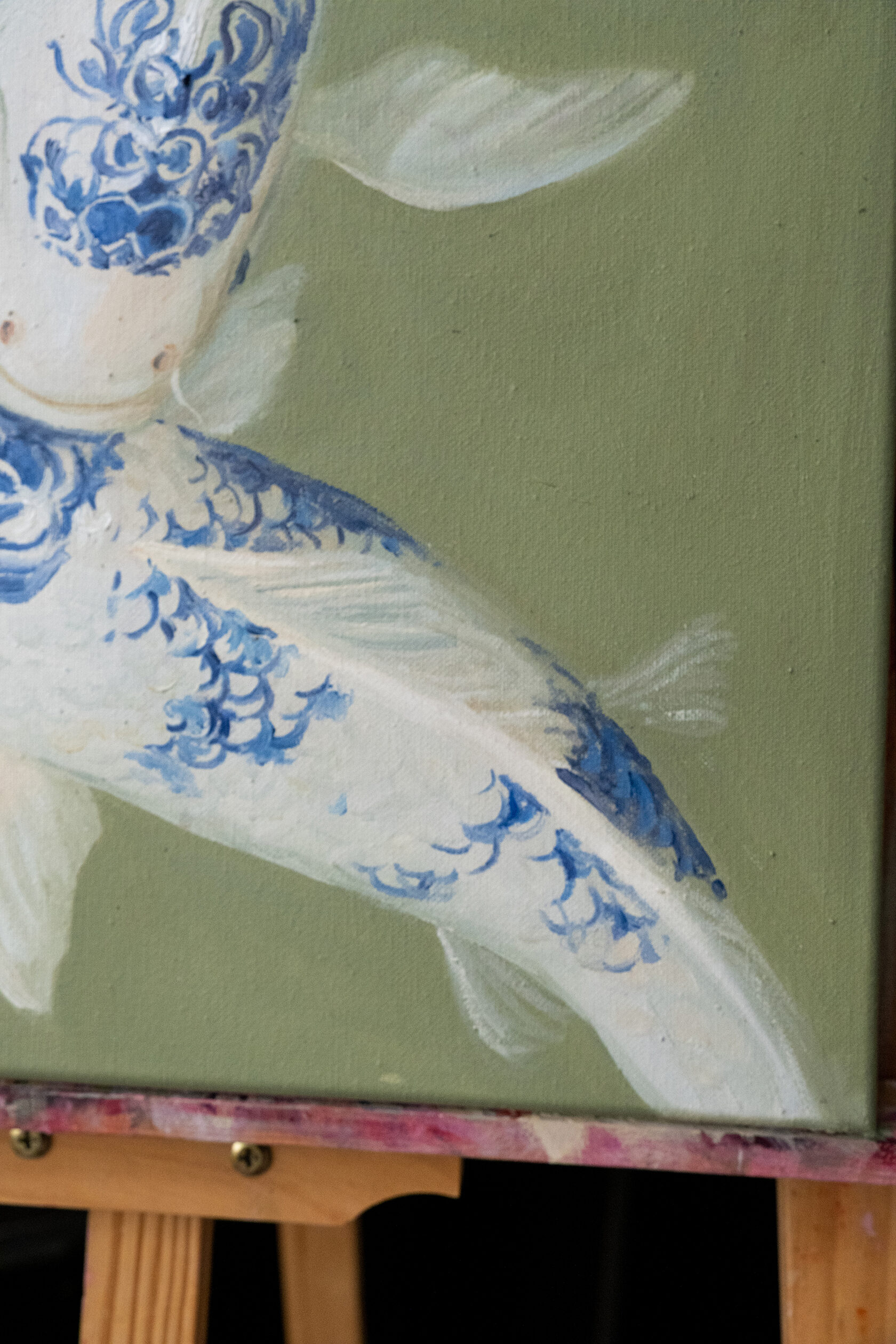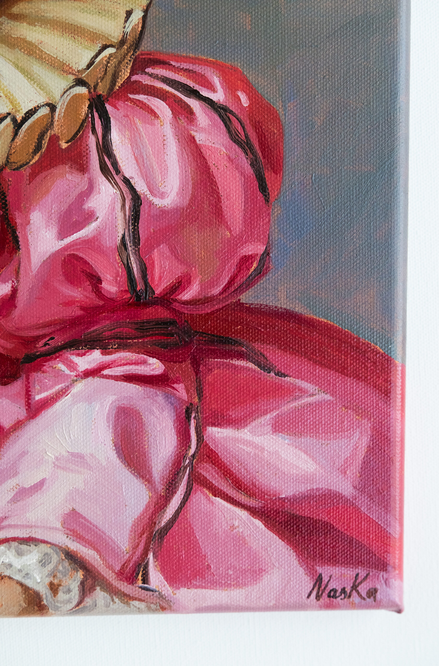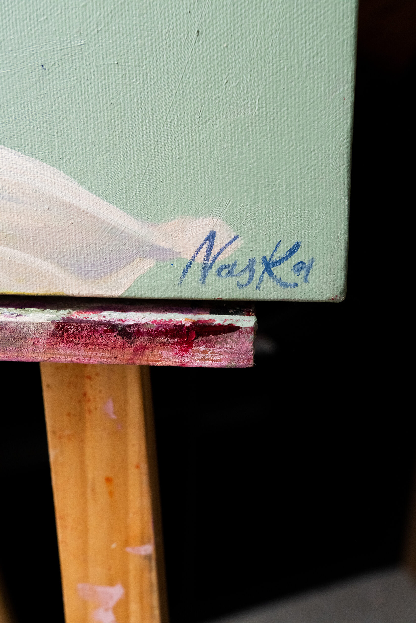 This painting was inspired by the fairy tale "The Princess and the Pea." She lives in her magical, soft world of rose-colored glasses, cotton candy, soap bubbles, and eternal peace.